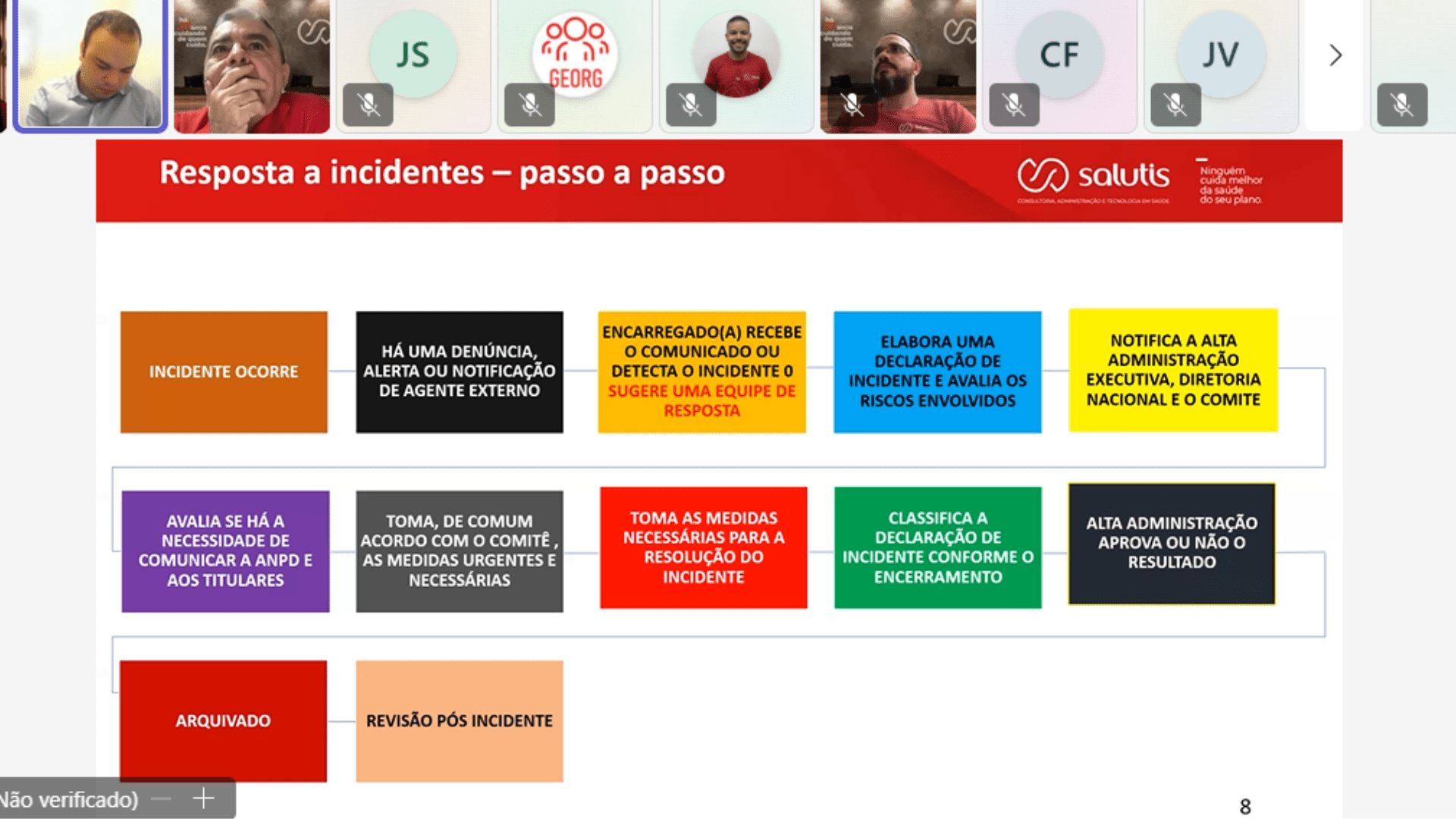 O encontro foi conduzido por Luiz Fernando Picorelli, Coordenador da Comissão LGPD da UNIDAS, e organizado pela DPO da Salutis, Kellen Abreu, reforçando o compromisso do Grupo em manter seus processos alinhados às melhores práticas de segurança e proteção de dados.
